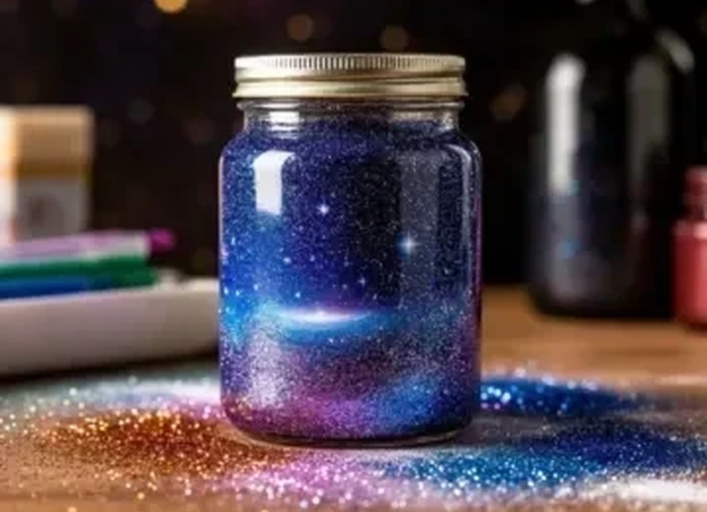 Создайте свою миниатюрную галактику в банке, используя яркие цвета и блестки.